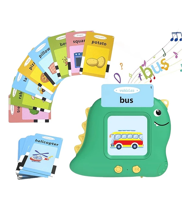 Este dispositivo de educación temprana está diseñado para niños a partir de los 3 años, fomentando el aprendizaje de idiomas de forma divertida y segura. Viene con tarjetas ilustradas clasificadas por categorías como animales, frutas, artículos del hogar, transporte, colores y más. Al insertar una tarjeta en la ranura, el dispositivo pronuncia en voz alta la palabra en español e inglés, ayudando al desarrollo del vocabulario y la comprensión auditiva en ambos idiomas.