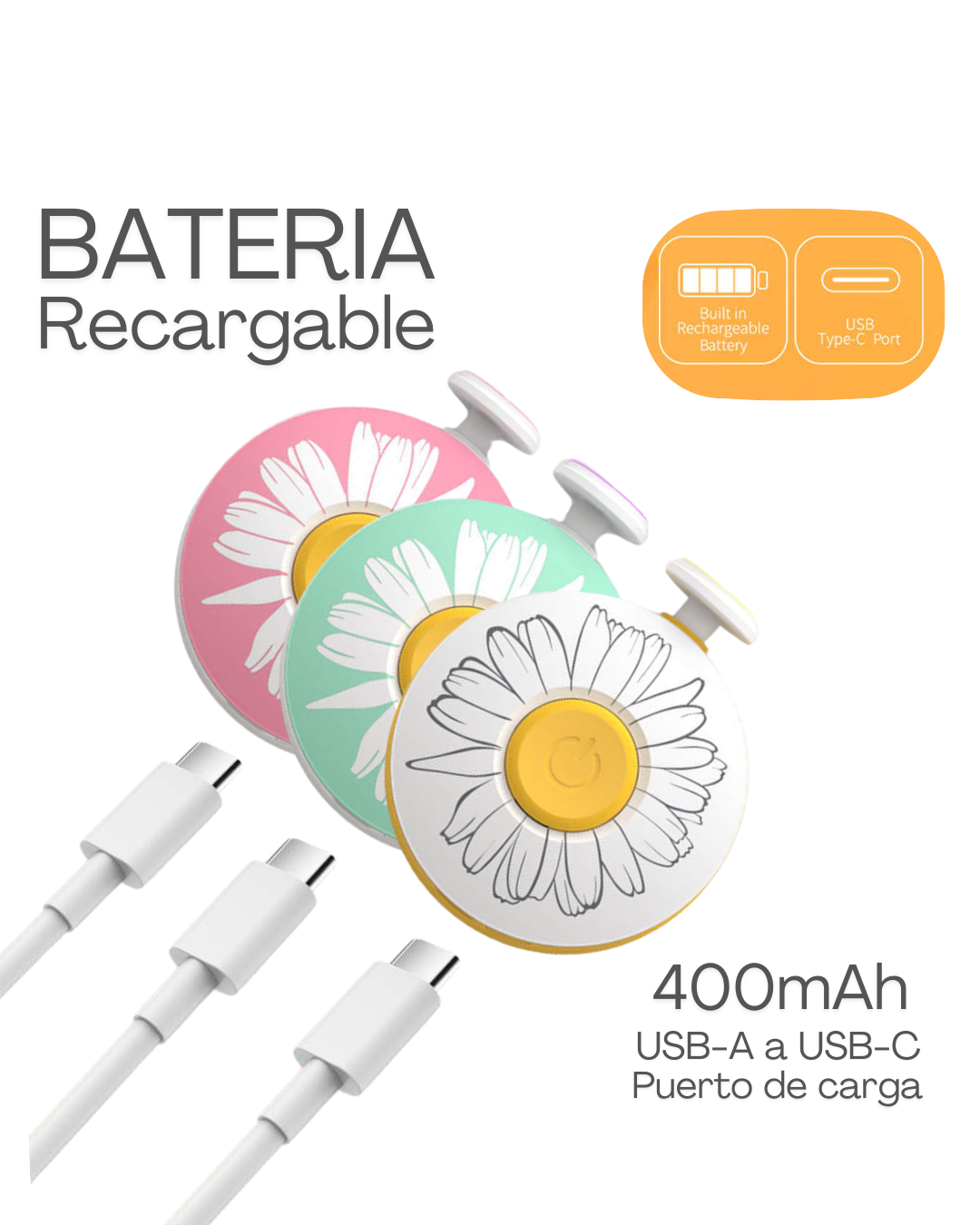 Presenta Batería recargable de 400 mAH incorporada, mas su cable C de recarga. No requiere pilas.